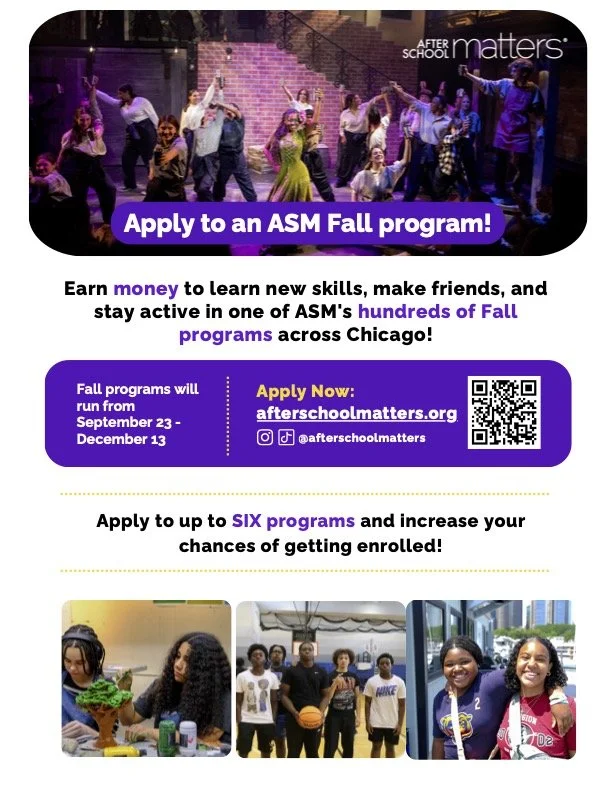 ¡Ya está abierta la convocatoria de otoño de After School Matters para adolescentes de Chicago! Este otoño, ASM ofrece cientos de programas en toda la ciudad entre las semanas del 23 de septiembre y el 13 de diciembre. Los programas están disponibles para adolescentes de entre 14 y 18 años que cursen estudios secundarios en Chicago. Todos los programas animan a los adolescentes a descubrir nuevas aficiones, crear comunidad y ganar dinero al mismo tiempo. Los adolescentes pueden presentar su solicitud aquí.