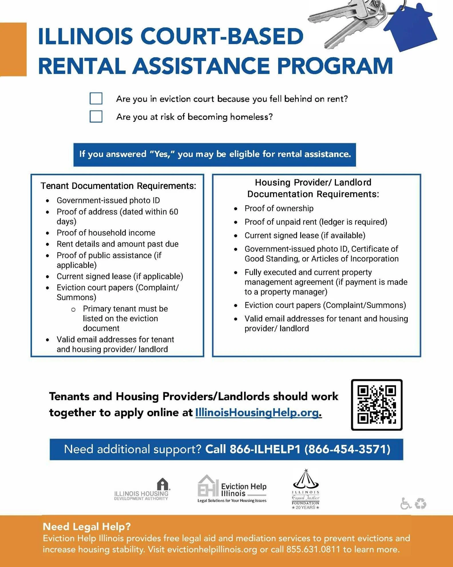 Los inquilinos de Illinois que tienen casos pendientes en los tribunales de desalojo ahora son elegibles para solicitar hasta $15,000 en pagos de alquiler de emergencia. Estos pagos de alquiler de emergencia pueden aplicarse a alquileres vencidos desde marzo de 2020. Los fondos también pueden pagar hasta $ 500 para costas judiciales y hasta dos meses de futuros pagos de alquiler para evitar un desalojo. Tenga en cuenta que se requiere un número de caso judicial de desalojo para aplicar. Más información aquí.