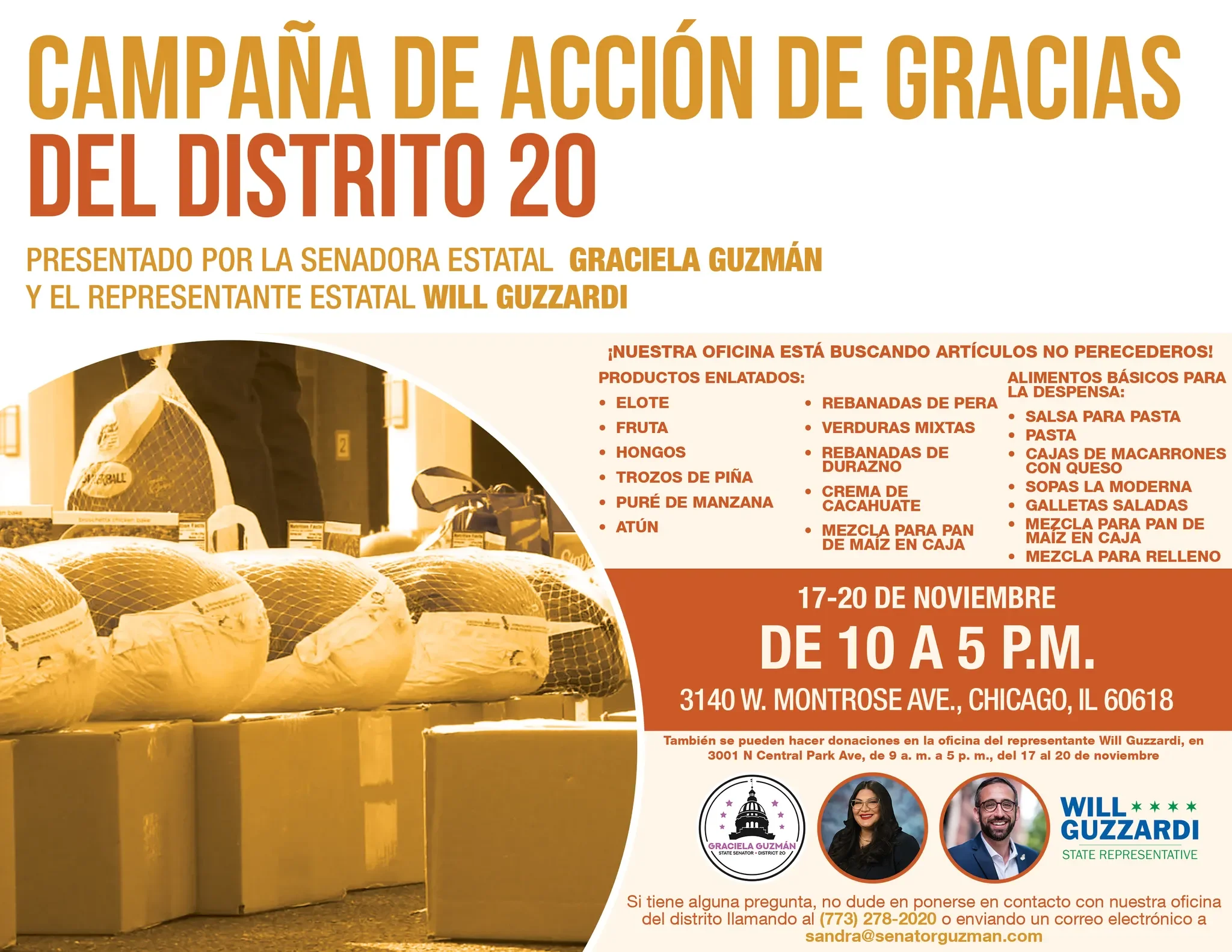 Puede entregar sus donaciones en la oficina de la senadora Guzmán, situada en 3140 W Montrose Ave, de 10am a 5pm, hasta el jueves 20 de noviembre, o en mi oficina, situada en 3001 N Central Park Ave, de 9am a 5pm, hasta el jueves 20 de noviembre. ¡Su generosidad marca realmente la diferencia!