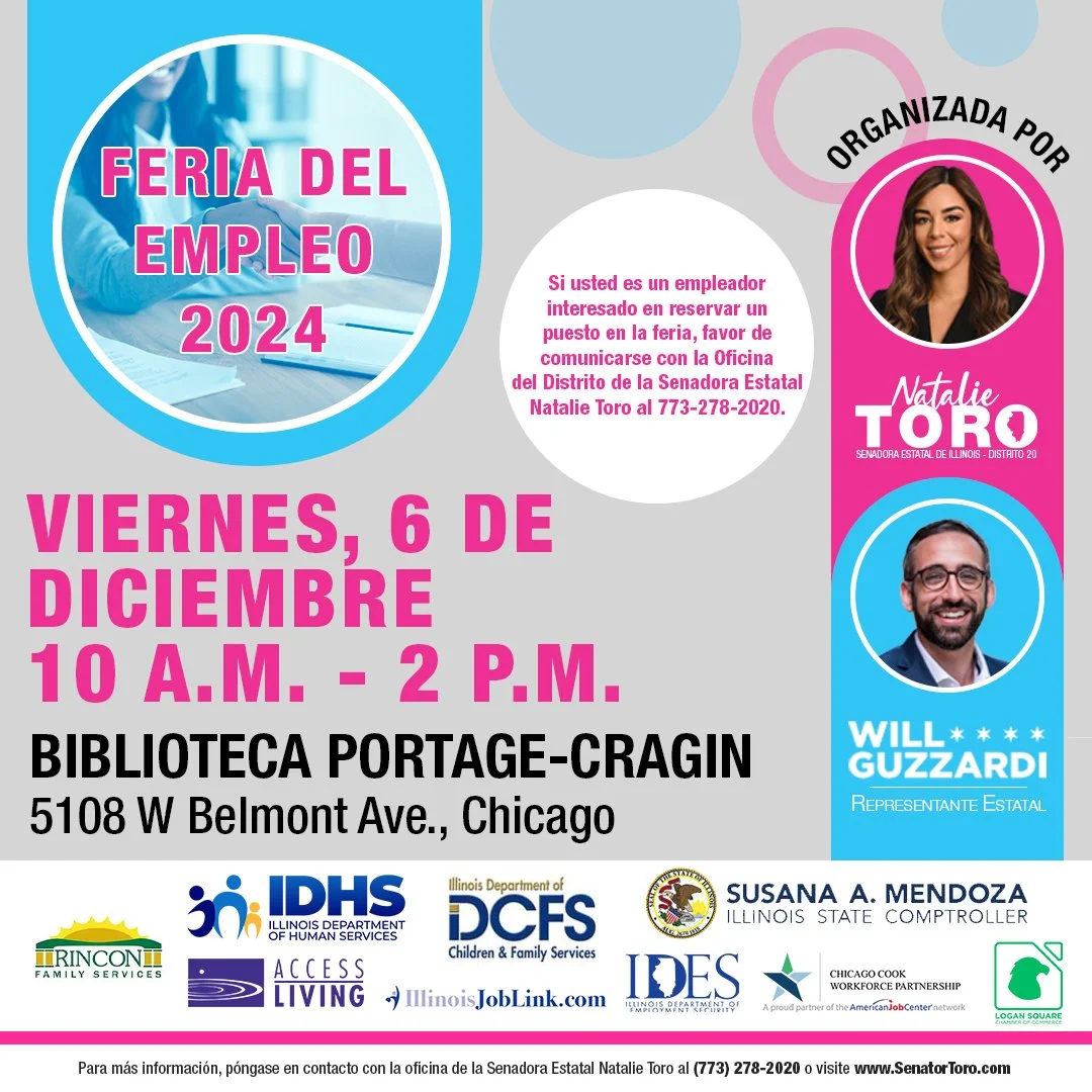 En colaboración con la oficina de la Senadora Toro, organizaremos una Feria de Empleo en la Biblioteca Portage-Cragin el viernes 6 de diciembre de 10 AM a 2 PM. La feria contará con representantes de organizaciones comunitarias y agencias estatales que buscan empleados. Entre los empleadores que nos acompañarán se encuentran Access Living, el Departamento de Seguridad de Empleo de Illinois, el Departamento de Servicios para Niños y Familias, y la Contraloría del Estado de Illinois.
