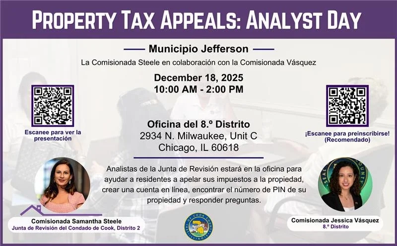La comisionada del condado de Cook, Jessica Vásquez, se ha asociado con los comisionados de la Junta de Revisión Cárdenas y Steele para organizar varios eventos de apelación de la Junta de Revisión en su oficina de Avondale. Como recordatorio, las apelaciones NO cambiarán las facturas fiscales actuales, pero tienen el potencial de cambiar el valor tasado de una propiedad, lo que podría dar lugar a facturas fiscales más bajas en el futuro. En cada uno de estos eventos, habrá entre 3 y 5 analistas que ayudarán a los residentes.