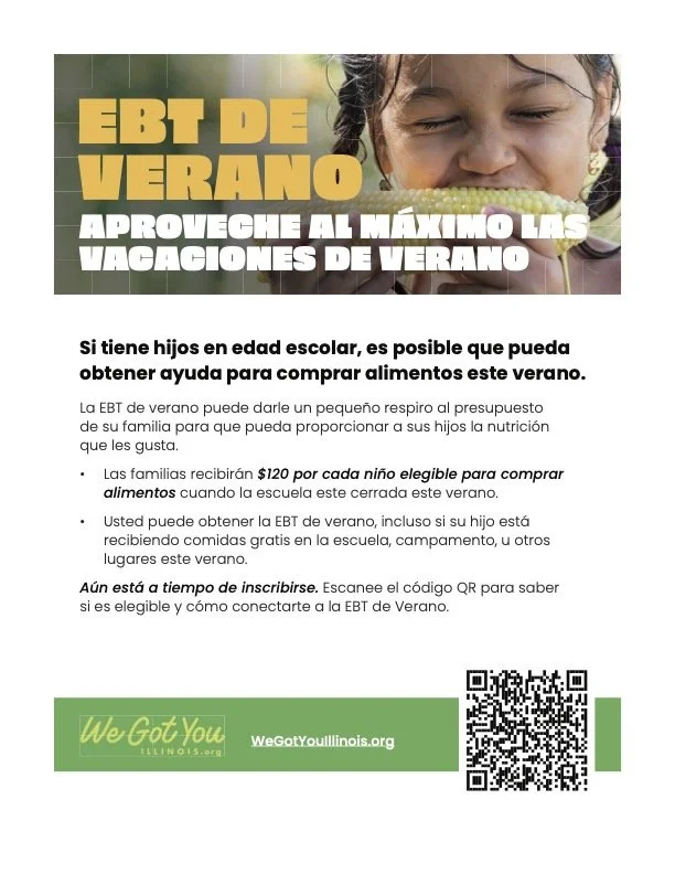 El EBT de verano proporciona a las familias con hijos en edad escolar una prestación mensual de comestibles para alimentar a sus hijos durante tres meses de verano, junio, julio y agosto, cuando los niños no reciben comidas gratuitas o a precio reducido en la escuela. En el verano de 2024, las familias recibirán una prestación única de 120 $ para el verano por cada hijo que cumpla los requisitos. Los beneficios se distribuyen en una tarjeta de transferencia electrónica de beneficios (EBT) y pueden utilizarse en tiendas minoristas autorizadas. Para más información sobre los requisitos y cómo solicitarlo, visite wegotyouillinois.org/summer-ebt.
