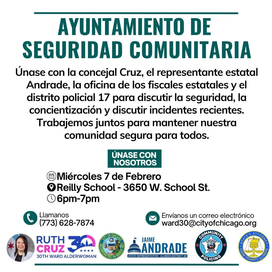 En el Distrito 30, habrá un Ayuntamiento de Seguridad de la Comunidad el miércoles 7 de febrero en la Escuela Reilly, 3650 W. School St. a las 6 pm. Y en el Distrito 1, habrá un Ayuntamiento de Seguridad Pública a mediados de febrero. Como se forman más detalles, nos aseguraremos de compartirlos.