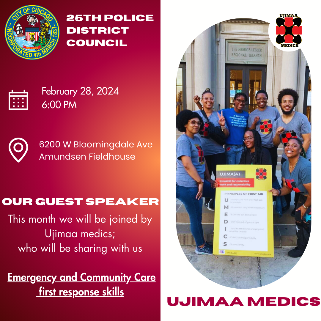 El Consejo del Distrito 25 de la Policía será acompañado por Ujimaa Medics para su reunión el miércoles, 28 de febrero, a las 6pm en Amundsen Fieldhouse, 6200 W Bloomingdale Ave. Ujimaa Medics impartirá una formación abierta al público sobre primeros auxilios y atención comunitaria.