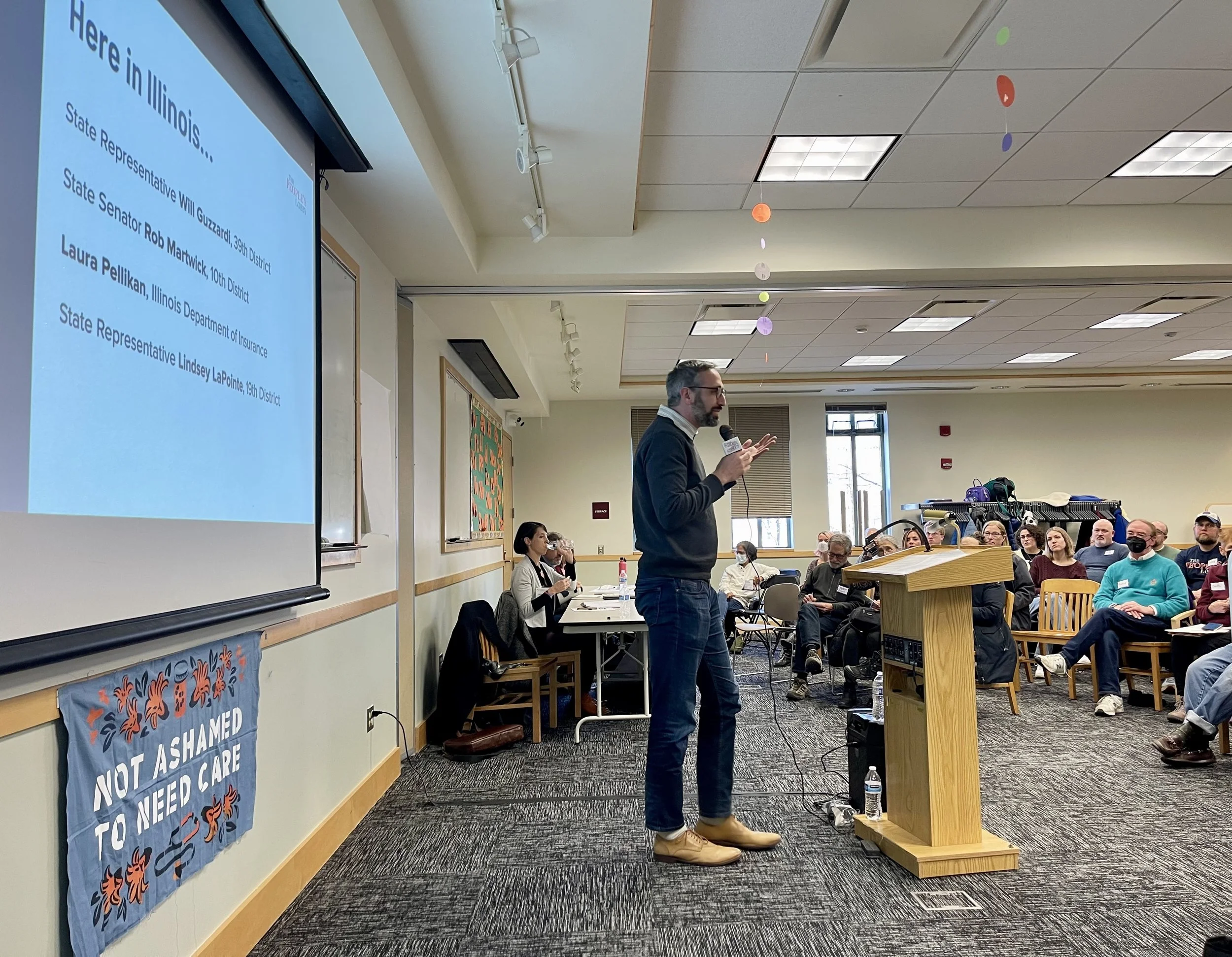 Escuchamos testimonios de nuestros vecinos sobre sus desafíos con las denegaciones de reclamaciones para laboratorios, recargas de medicamentos esenciales y procedimientos médicamente necesarios. Nos informamos sobre la asistencia que ofrece el Departamento de Seguros de Illinois y sobre la próxima legislación para mejorar el acceso a la asistencia sanitaria, incluida la asistencia mental. Nos enteramos de la necesidad de aumentar las tasas de reembolso de Medicaid para ampliar las redes de proveedores, ya que hay 4 millones de afiliados a Medicaid en Illinois, ¡un tercio de la población del estado! Y hicimos un llamamiento a la acción para seguir abogando por una legislación que nos acerque a la garantía de la asistencia sanitaria como un derecho humano para todos.