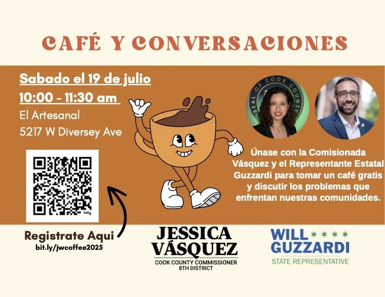 Acompáñenos a Jessica Vásquez, Comisionada del Condado de Cook, y a mà para tomar un café y discutir los problemas que enfrentan nuestras comunidades. Estaremos en El Artesanal, 5217 W Diversey Ave. el sábado 19 de julio de 10 a 11:30am. Por favor RSVP en el código QR en el volante anterior. Por favor regÃstrese en bit.ly/jwcoffee2025.