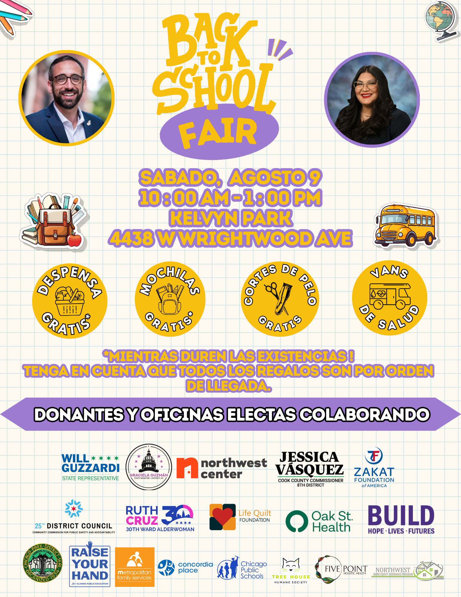 ¡Únete a mi oficina, la Senadora Estatal Graciela Guzmán, y el Centro del Noroeste el sábado, 9 de agosto, de 10am a 1pm en Kelvyn Park, 4438 W Wrightwood para nuestra Feria Anual de Regreso a la Escuela! Estamos ofreciendo: