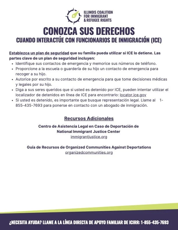 Para terminar, animamos a los miembros de la comunidad a informar de cualquier posible avistamiento de ICE llamando a la lÃnea directa de la Red de Apoyo Familiar de ICIRR al (855) 435-7693. Puede acceder a diversos recursos de inmigración en bit.ly/nwsresources, y también puede ponerse en contacto con mi oficina—estaremos encantados de ayudarle a ponerse en contacto con organizaciones y servicios de apoyo.