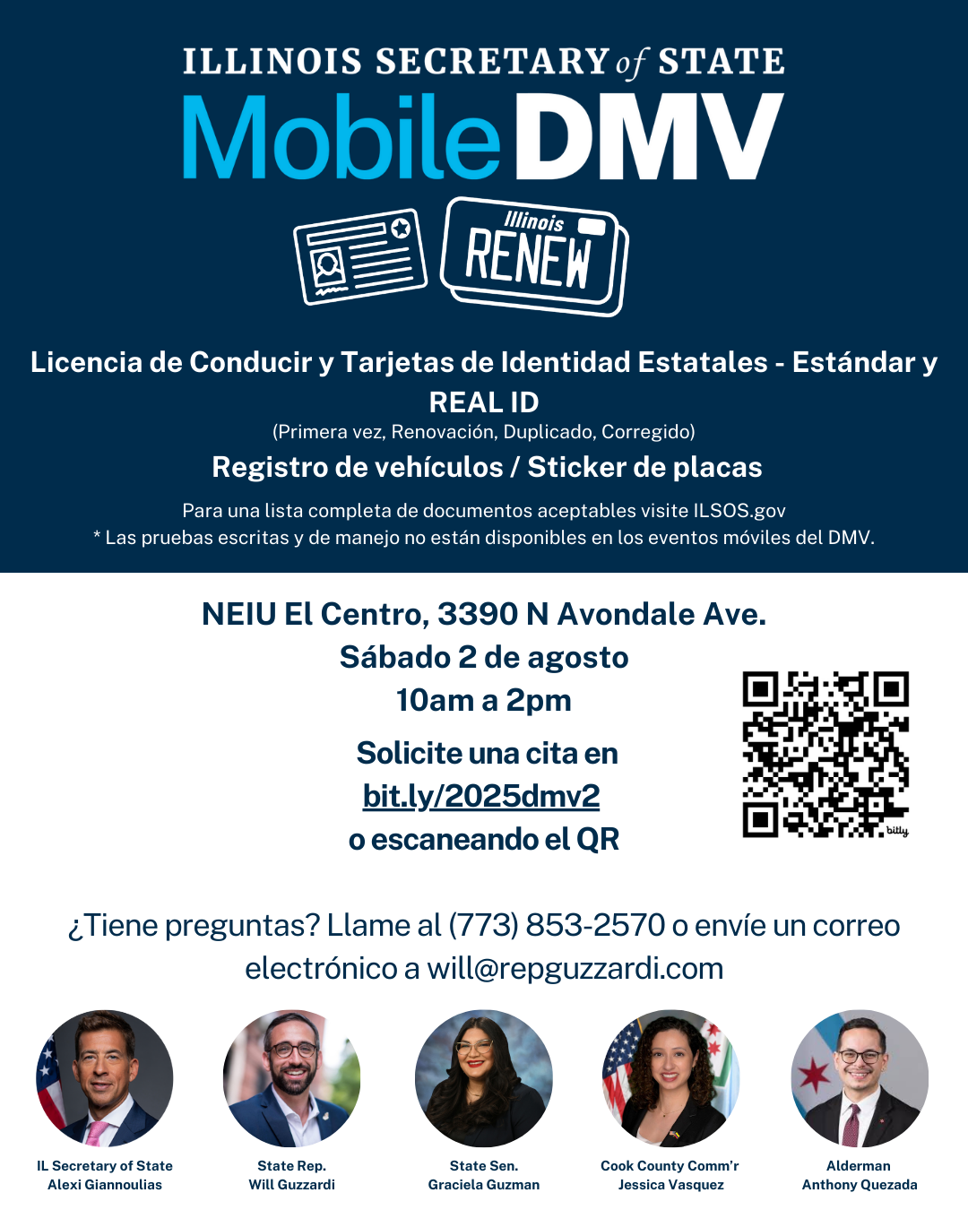 Nuestra oficina se está asociando con el Secretario de Estado y Northwest Side Funcionarios Electos para un DMV móvil el sábado, 2 de agosto. Únase a nosotros de 10am a 2pm en NEIU El Centro, 3390 N Avondale Ave. Tenga en cuenta, las citas requieren un RSVP. Usted puede encontrar más información y registrarse para una cita aquÃ: bit.ly/2025dmv2.