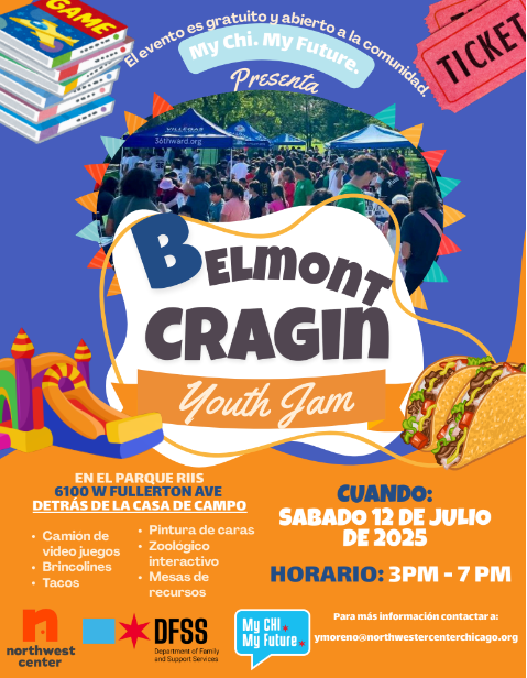 Northwest Center está organizando un Youth Jam el sábado 12 de julio de 3 a 7pm en Riis Park, 6100 W Fullerton. Habrá un camión de juegos, tacos, un castillo inflable, pintura de caras, recursos comunitarios y otras divertidas actividades de verano.