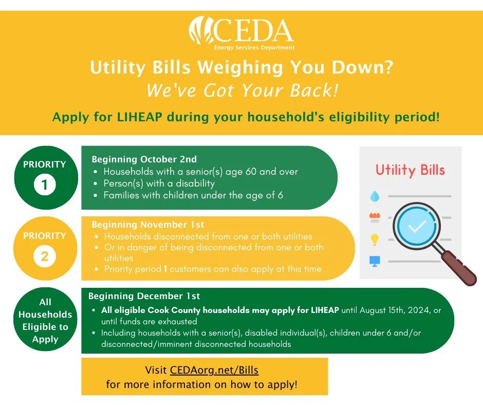 LIHEAP, el programa gratuito de ayuda para pagar las facturas de los servicios públicos, volverá el 2 de octubre. Los hogares que reúnan los requisitos de ingresos podrán solicitar ayuda para pagar las facturas de calefacción y/o electricidad durante el periodo de elegibilidad. La CEDA también tiene noticias interesantes. Los propietarios de viviendas que cumplan los requisitos pueden recibir vales para reparar o sustituir sus sistemas de calefacción, como hornos y calderas. Llame al (800) 571-2332 o visite www.CEDAorg.net/Bills para obtener más información.