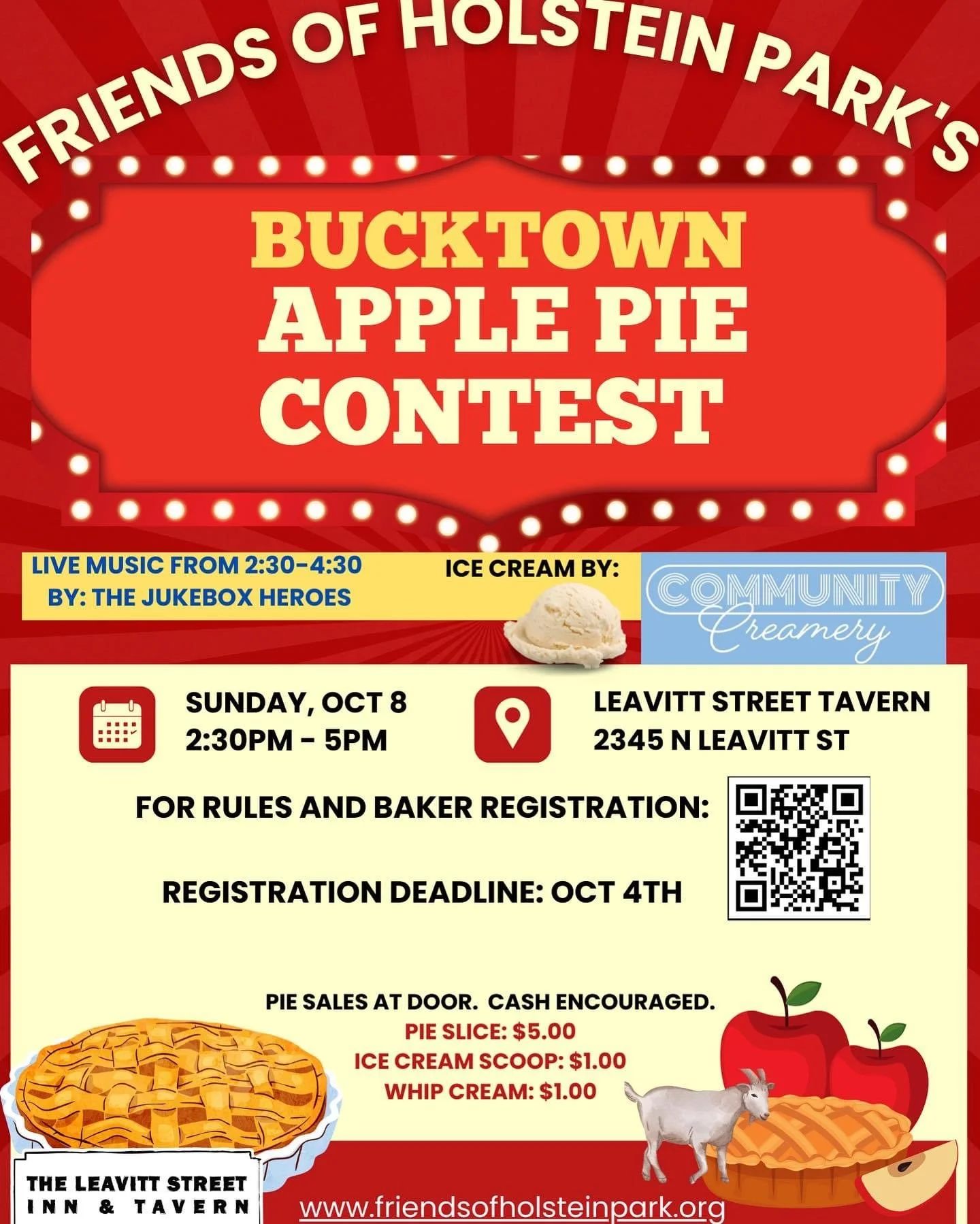 Únase a los Amigos de Holstein Park para un Concurso de Tarta de Manzana Bucktown el domingo, 8 de octubre a las 1:30 pm en Leavitt Street Tavern, 2345 N. Leavitt St. Todas las donaciones y ventas de pasteles se utilizarán para financiar una renovación de la cancha de tejo en Senior Citizens Memorial Playlot Park.