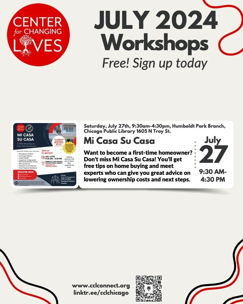 The Center for Changing Lives is hosting a variety of workshops throughout July, covering topics such as small business management, estate planning, and first-time home ownership. See the fliers above for further details.