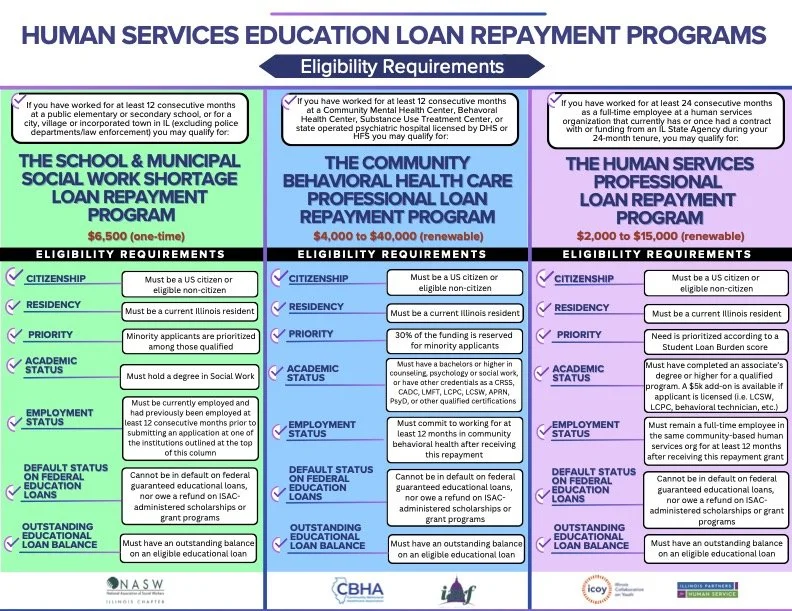 If you have worked at a community-based organization that provides human services in Illinois for 2 years or more, you may be eligible for up to $15,000 in student loan repayment from the Human Services Professional Loan Repayment Program! Brought to you by Illinois Partners for Human Service, Illinois Collaboration on Youth, and Illinois Student Assistance Commission. More info is HERE.