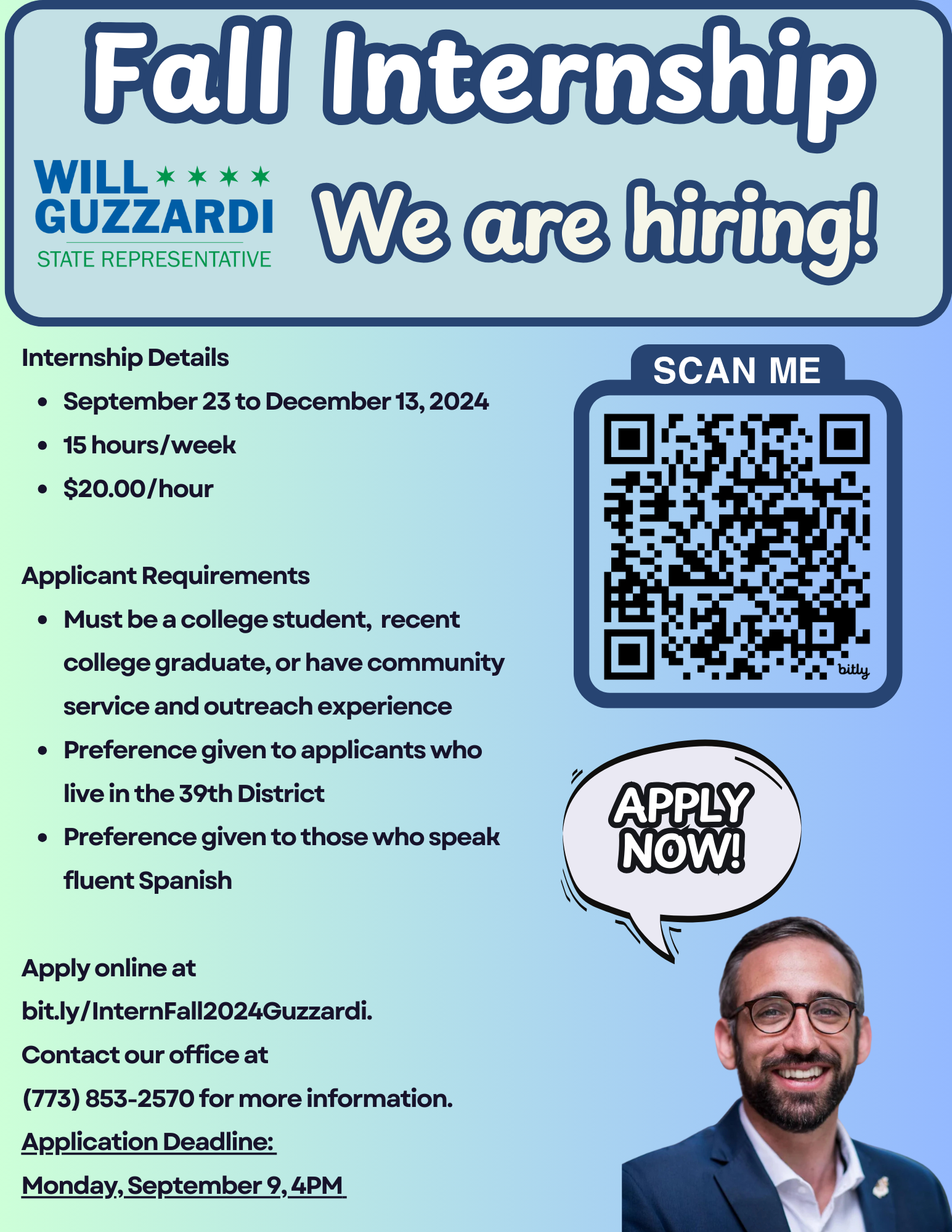 Our office is hiring a Community Outreach Intern for the fall, from September 23 to December 13, 2024! Interested applicants can learn more about the position and apply at bit.ly/InternFall2024Guzzardi or contact our office at (773) 853-2570. The deadline to apply is Monday, September 9 at 4pm.