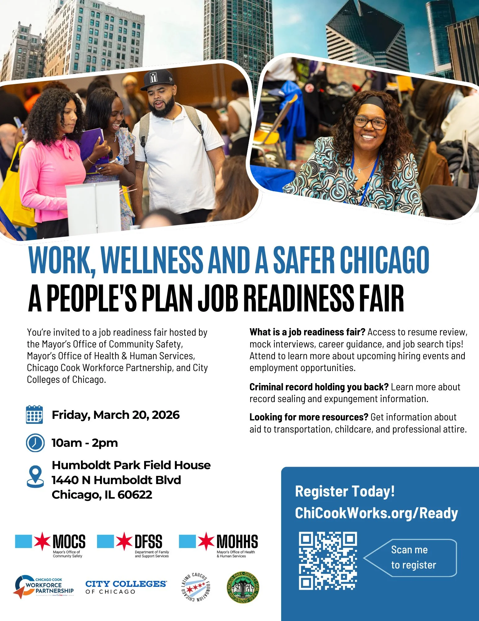 The Mayor’s Office of Community Safety, in partnership with the Mayor's Office of Health and Human Services, Chicago Cook Workforce Partnership, Chicago Park District, City Colleges of Chicago, Department of Family and Support Services, and local community-based organizations invite you to Work, Wellness and a Safer Chicago: A People's Plan Job Readiness Fair.