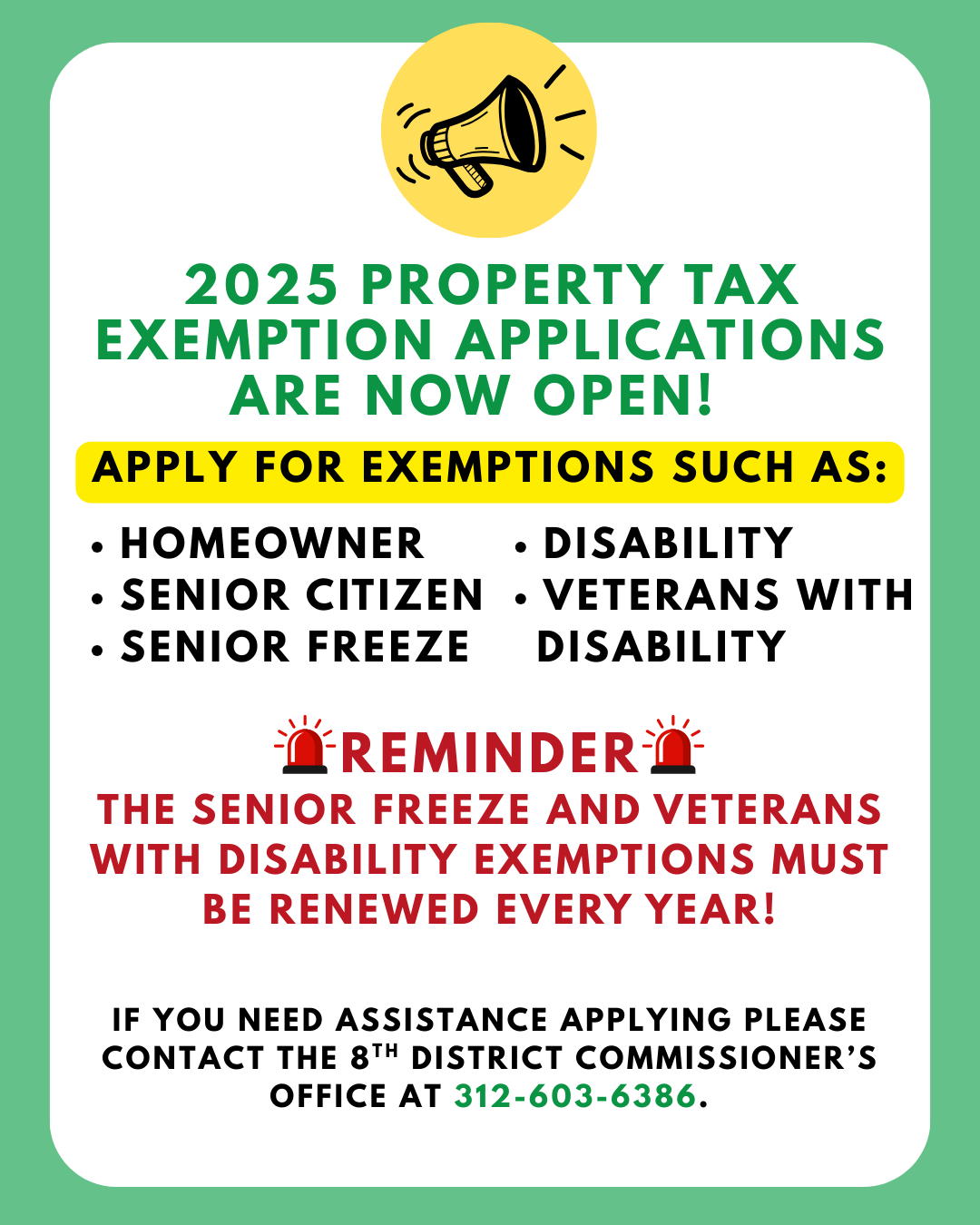 Applications for property tax exemptions for 2025 are now open. If you are a resident of the 8th District of Cook County, please reach out to Commissioner Jessica Vasquez’s office at (312) 603-6386, if you would like to set up an appointment for assistance.