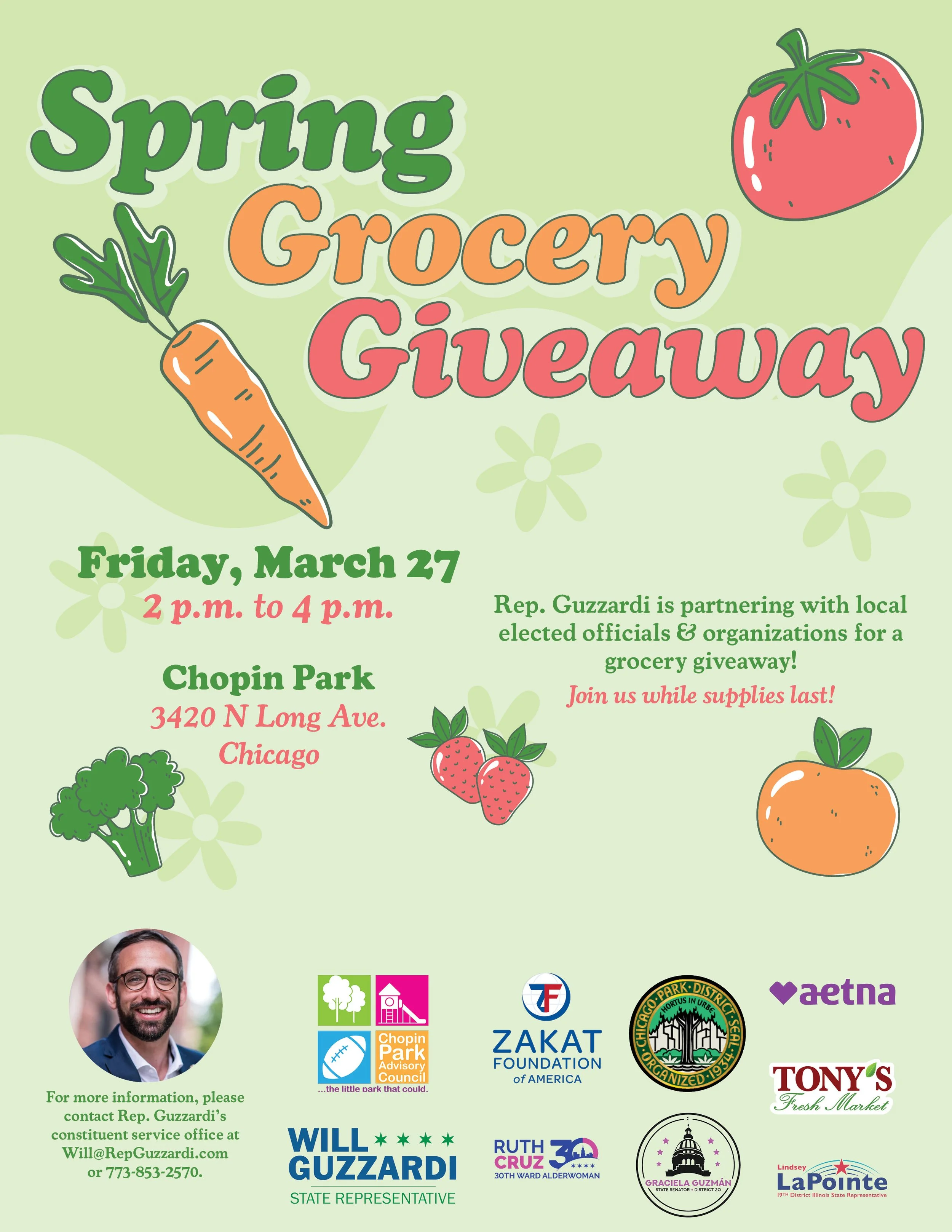 My office is partnering with local elected officials and organizations for a grocery giveaway on Friday, March 27 from 2 to 4pm. Join us at Chopin Park, 3420 N Long Ave. while supplies last; first come, first serve!