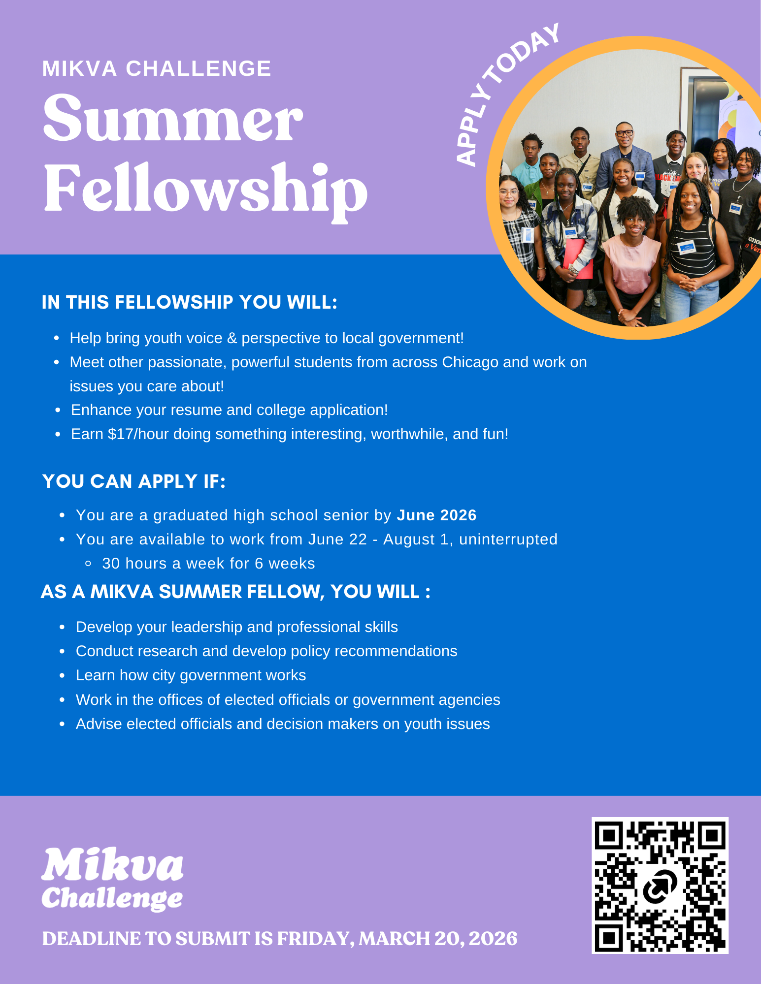 Mikva Challenge Summer Fellows is a six-week program that places 50 young people after their senior year to serve as Fellows in the offices of city, county, state, and federal officials across the city of Chicago for 30 hours per week, for 6 weeks between June and August. Mikva Challenge partners with the Illinois Department of Human Services Youth Investment Program (IYIP) to support this paid internship opportunity for Cook County youth. The IYIP partnership allows Mikva Challenge to pay Fellows $17 per hour for their hard work and valuable contributions in their offices. Fellows also participate in weekly educational workshops that center on community building, goal setting, leadership development, and workplace readiness.