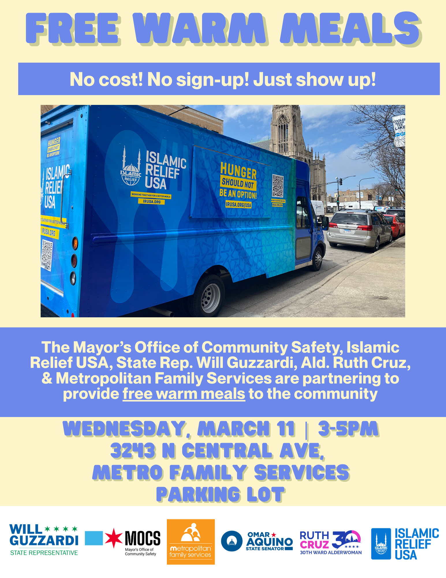 My office is partnering with the Mayorβs Office of Community Safety, Islamic Relief USA, State Sen. Omar Aquino, Alderwoman Ruth Cruz, and Metropolitan Family Services for a community meal. Thereβs no cost, no need to register to stop by and grab a free hot meal on Wednesday, March 11. From 3 to 5pm, we'll be at 3243 N Central Ave, the Metro Family Services parking lot at the border of Belmont Cragin and Portage Park.