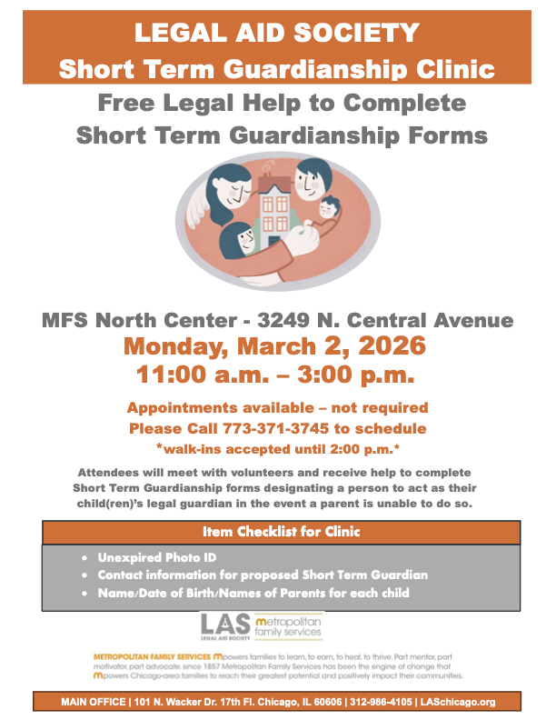 Starting on Monday, March 2, Legal Aid Society will be hosting short-term guardianship legal clinics on the first Monday of the month from 11am to 3pm at Metro Family Services North Center. 3249 N. Central Ave. Appointments are not required but recommended and can be made by calling (773) 371-3745. Language interpretation services will be available.