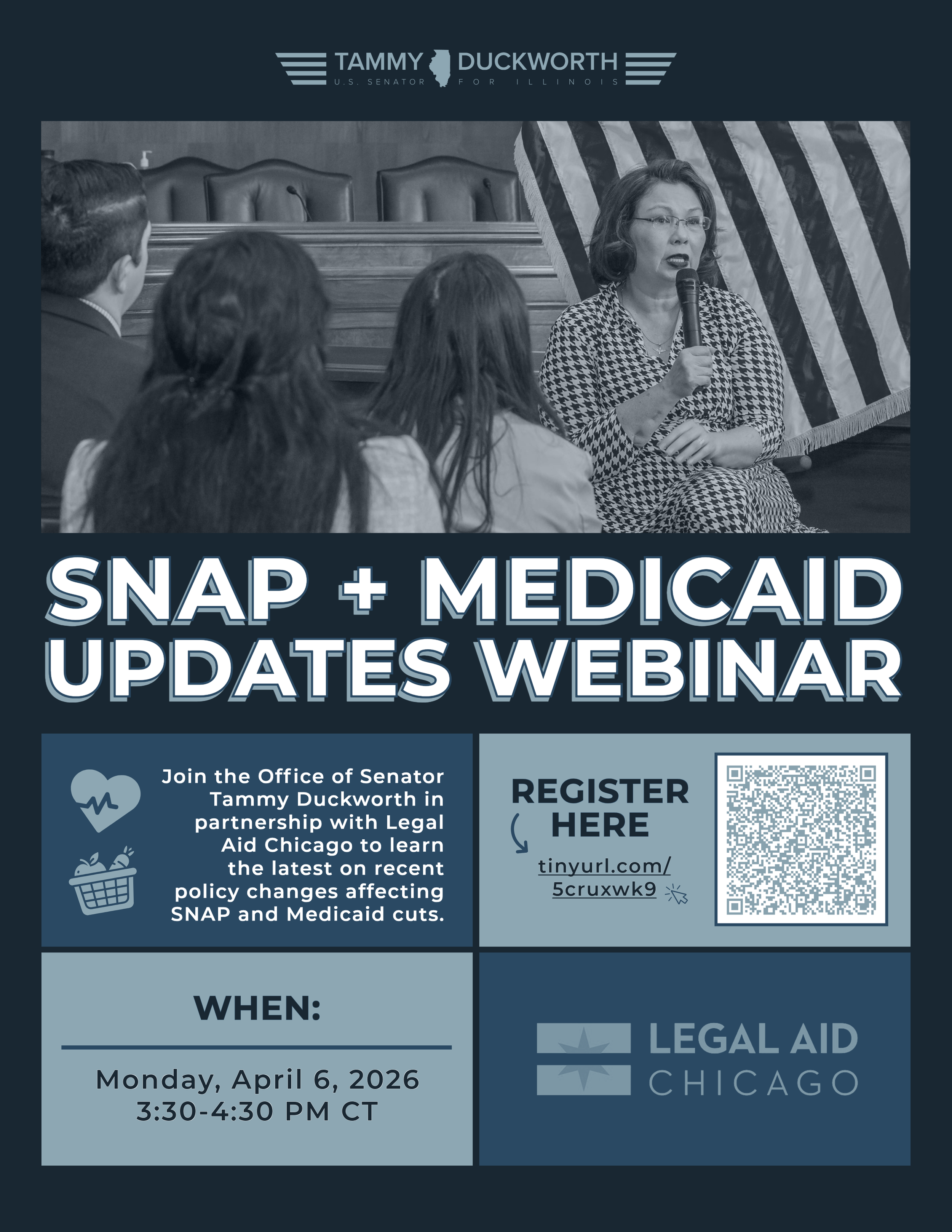 This is an opportunity for constituents to hear from representatives from Legal Aid Chicago on topics including new federal rules affecting SNAP and Medicaid, Illinois state-level implementations and what participants need to know and prepare for given these changes. Attendees must register here.