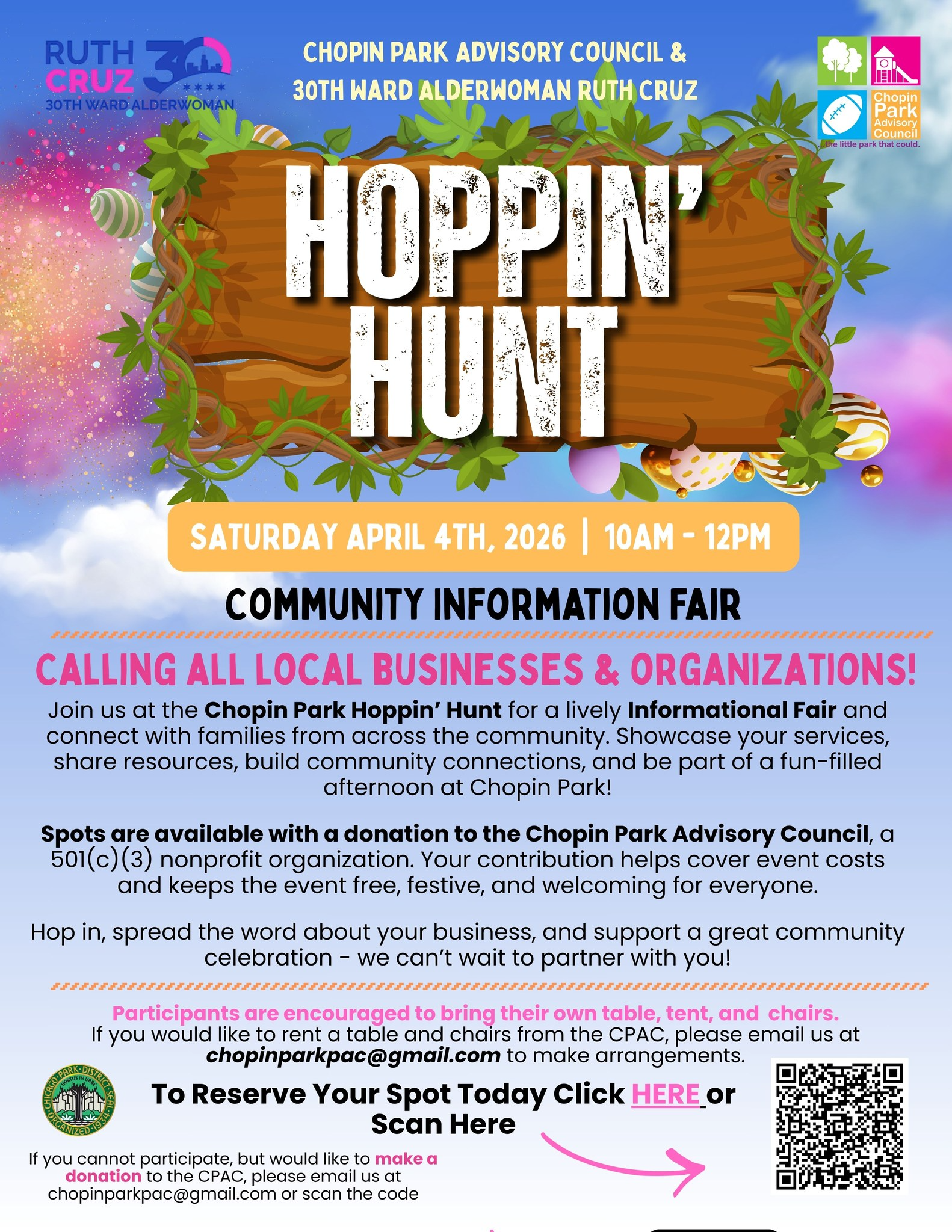 The Chopin Park Advisory Council is hosting an easter egg hunt on Saturday, April 4 from 10am to 12pm at Chopin Park, 3420 N Long Ave. This event is free to the public and will include an egg hunt for children 5 years and under at 10am, and then egg hunts every half hour after.