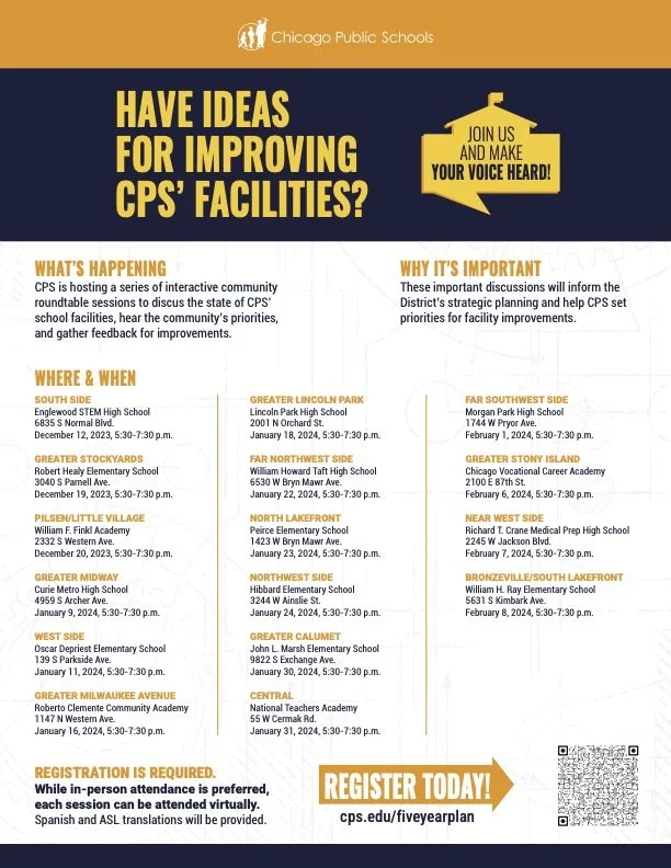 Chicago Public Schools will host 16 roundtables across the city through February to discuss its Educational Master Facilities Plan (EMFP). The EMFP roundtables are a version of capital/facilities engagement to improve the District’s strategy for an optimal student experience. Please view the flier above to learn more about upcoming roundtables.