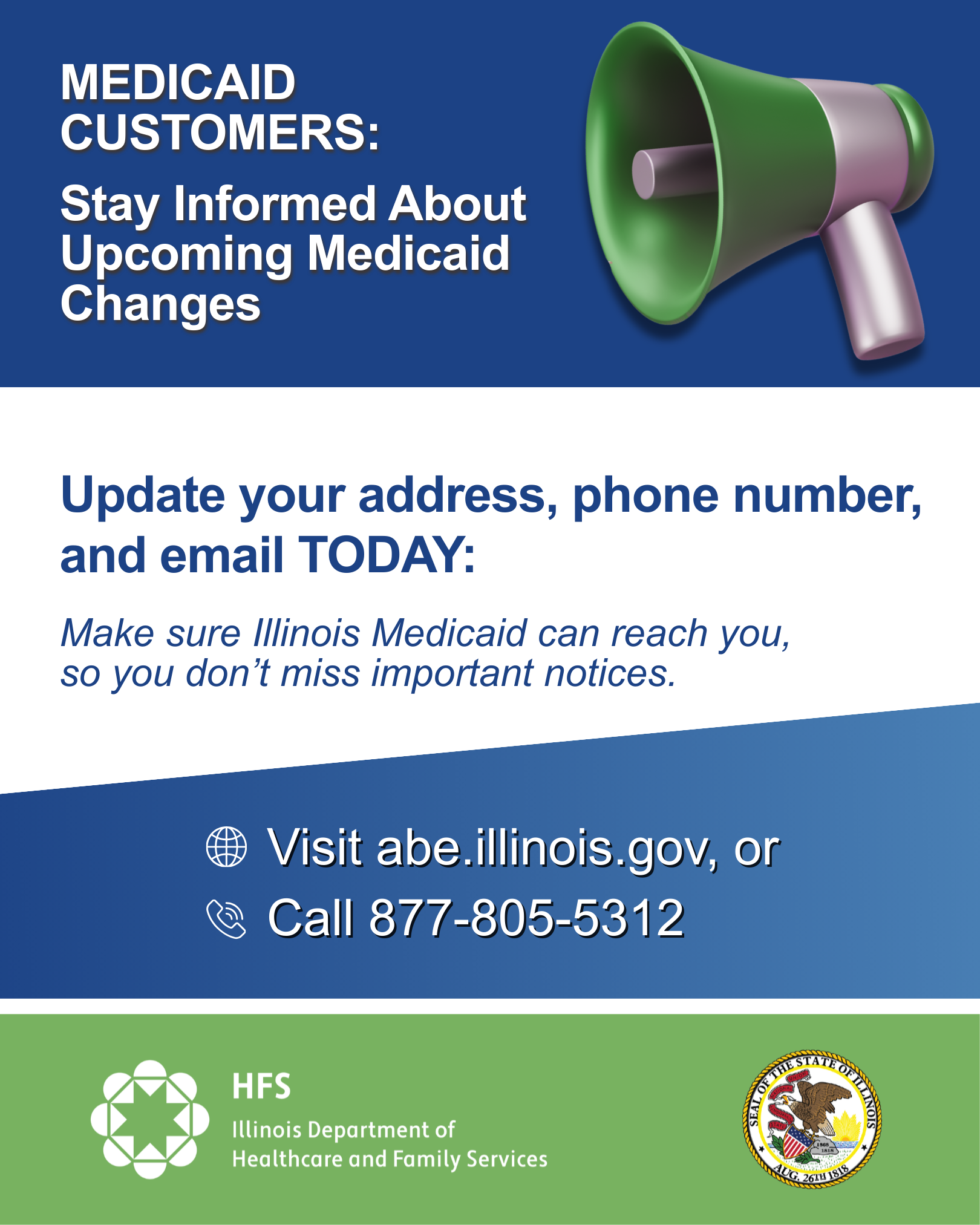 Beginning in 2027, new federal requirements may require some adult Medicaid recipients to report work, school, or training activities. Many individuals will be exempt, and no one will be required to take action until they receive direct notice from the State. Be sure to update your address, phone number, and email today to avoid missing any important notices. You can do this by visiting abe.illinois.gov or by calling (877) 805-5312.