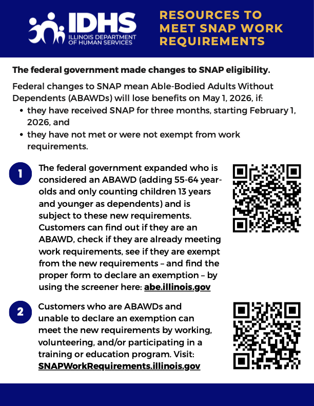 Those who must meet the new requirements can do so through employment, volunteering, or participation in training or education programs. Resources are available at SNAPWorkRequirements.illinois.gov.