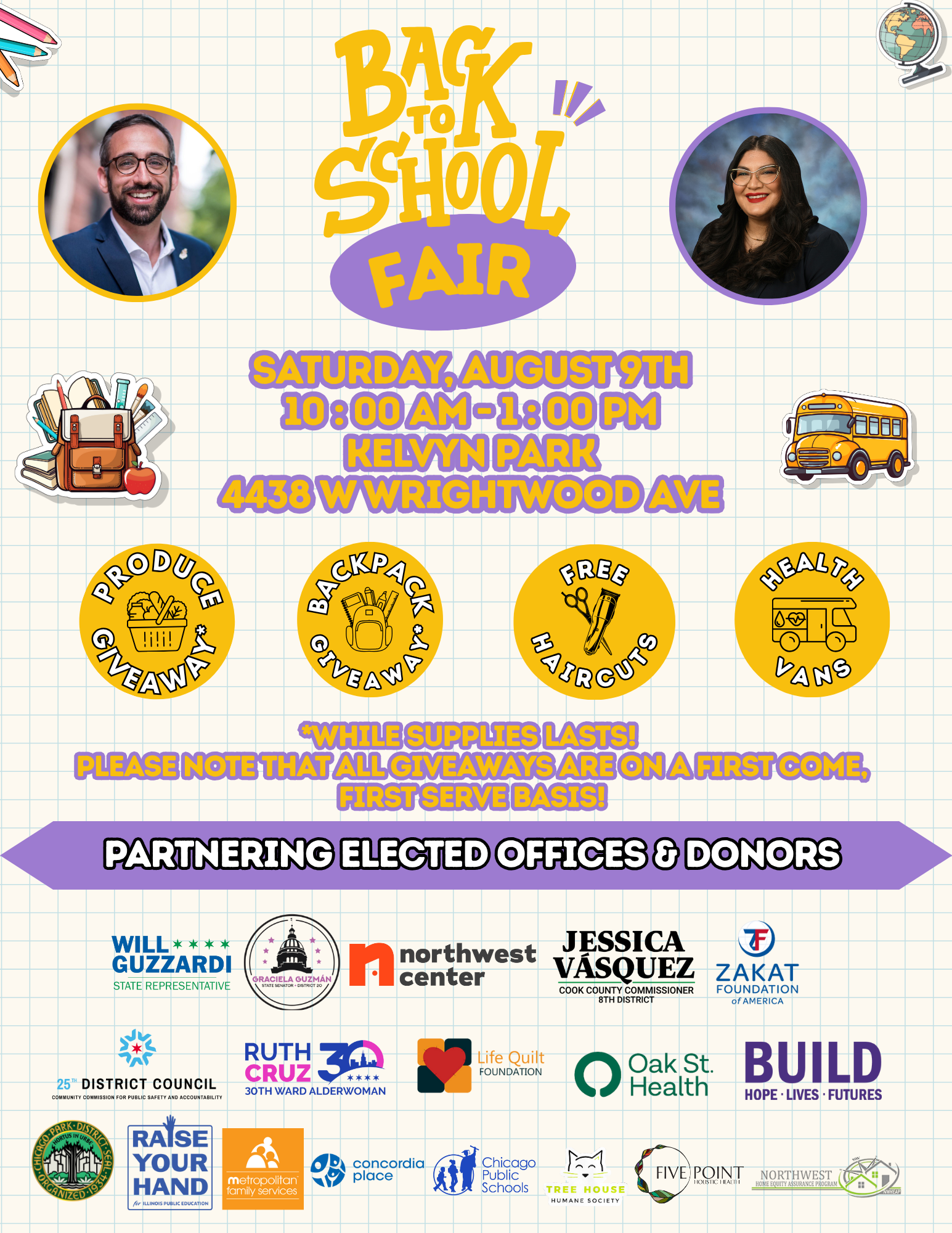 Join my office, State Senator Graciela Guzman, and Northwest Center on Saturday, August 9, from 10am to 1pm at Kelvyn Park, 4438 W Wrightwood for our Annual Back to School Fair!