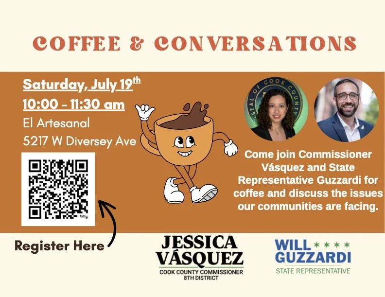 Join Cook County Commissioner Jessica Vasquez and me for coffee and a chance to discuss issues that are facing our communities. We’ll be at El Artesanal, 5217 W Diversey Ave. on Saturday July 19 from 10 to 11:30am. Please RSVP at the QR code on the above flyer. Please register at bit.ly/jwcoffee2025.