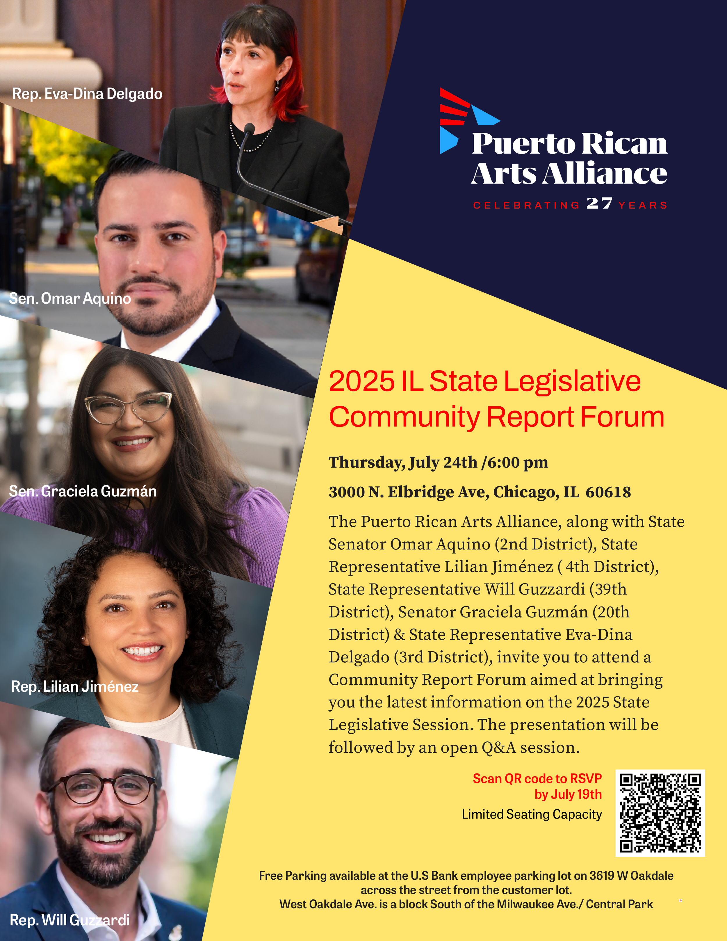 The Puerto Rican Arts Alliance is hosting their IL State Legislative Community Report Forum on Thursday, July 24 at 6pm at 3000 N Elbridge. Seating is limited so please RSVP using the QR code on the flyer by Saturday, July 19. Hope to see you there!