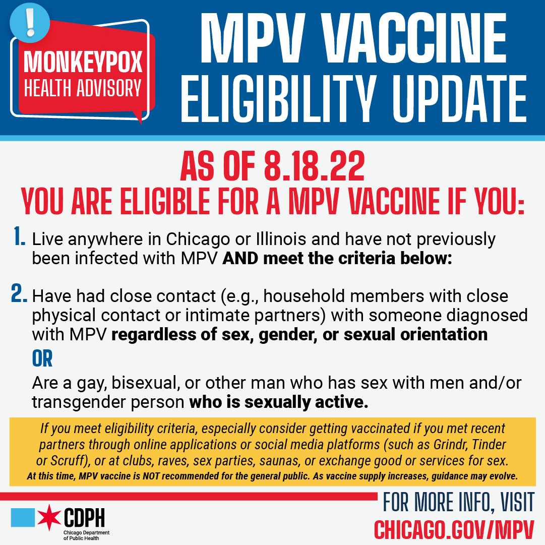 The Chicago Department of Public Health announced last week that the city will receive an additional 20,000 doses of MPV (monkeypox) vaccine from the Strategic National Stockpile and will distribute them to clinics across Chicago over the next week.