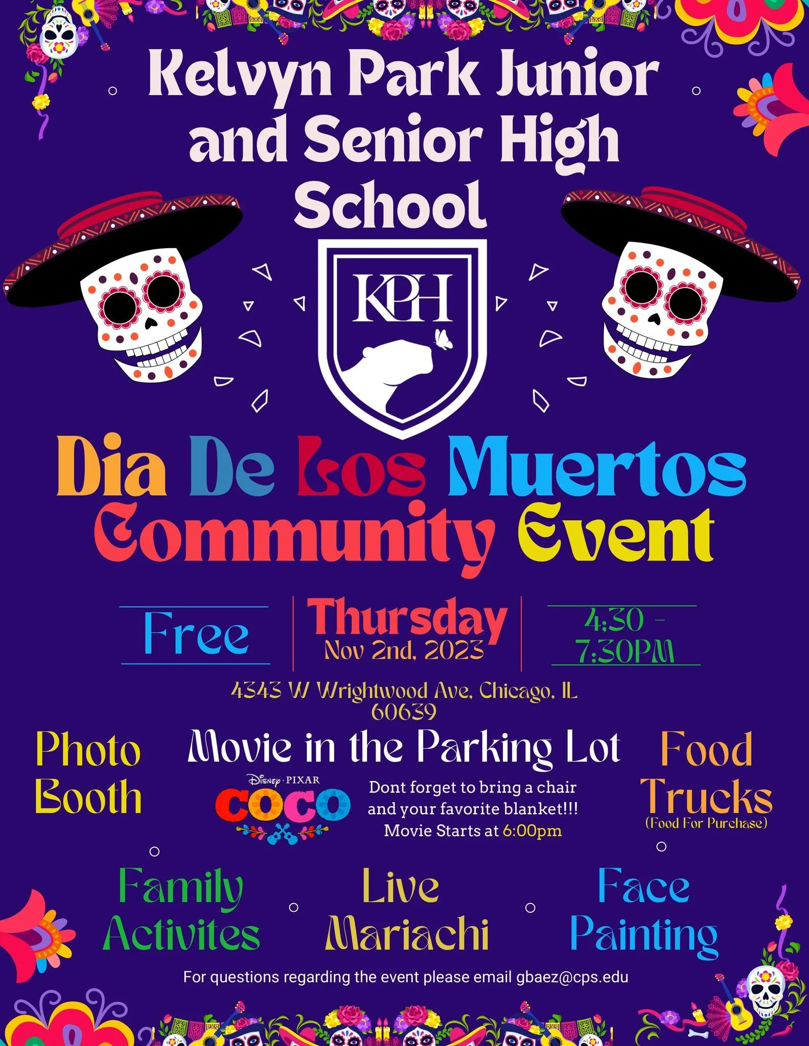 Join PLSNA and community members at a DΓa de Muertos Community Event on Thursday, November 2, from 4:30-7:30pm at Kelvyn Park Junior & Senior High School, 4343 W. Wrightwood Ave. There will be a free movie in the parking lot, a live mariachi, face painting, a photobooth, and food trucks!