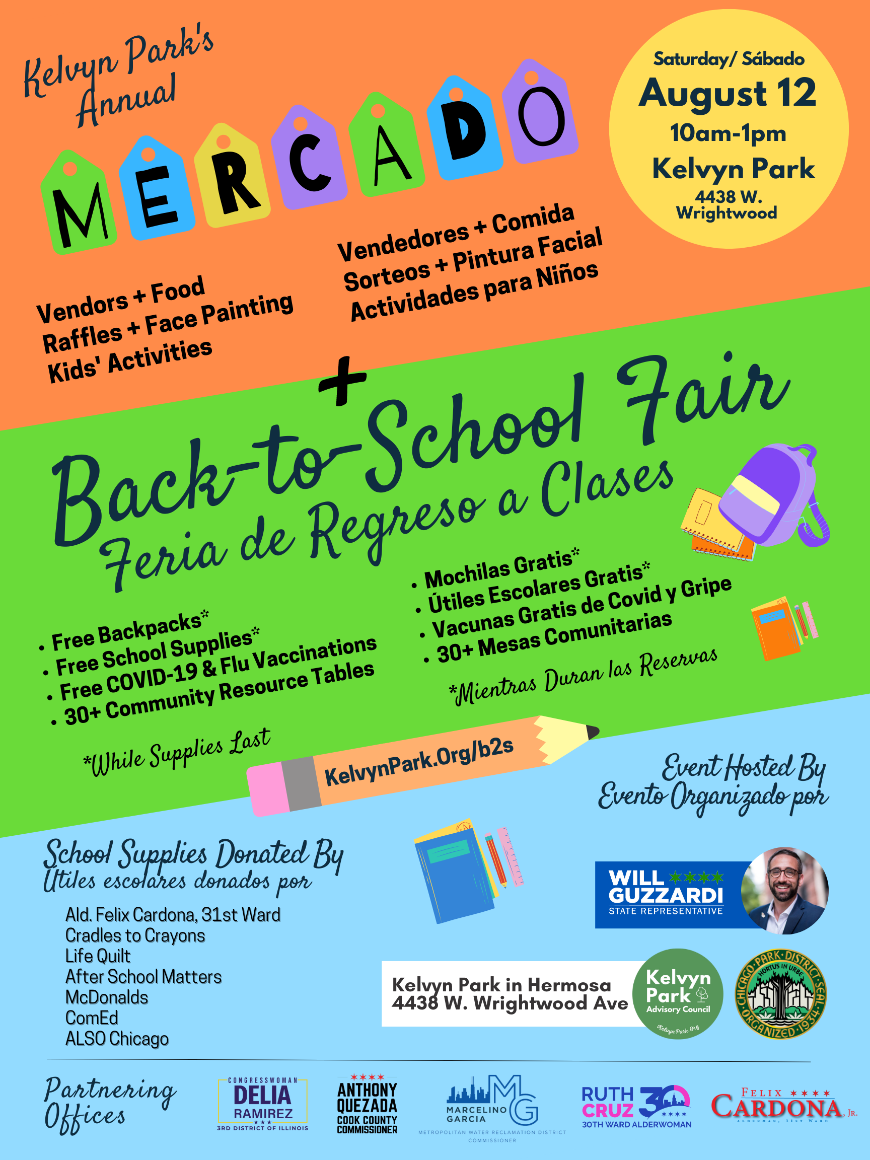 We are less than three weeks out from our Annual Back-to-School Fair + Mercado with the Kelvyn Park Advisory Council. We have been organizing this event for the past three years, and every year it is a wonderful opportunity to offer accessible resources and supplies to students and their families. We hand out hundreds of backpacks, enjoy food from local vendors, and celebrate the close of summer together.