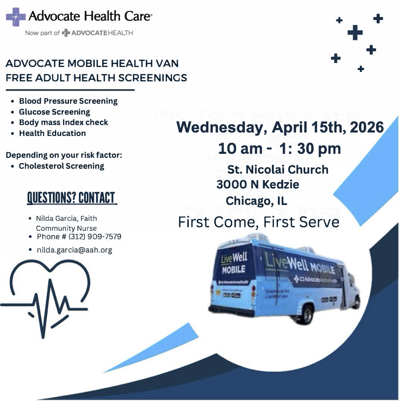 On Wednesday, April 15, from 10am to 1:30pm, Advocate Health Care will have their Mobile Health Van at St. Nicolai United Church of Christ, 3000 N Kedzie Ave., available for free health screenings, like blood pressure, glucose, and cholesterol checks.