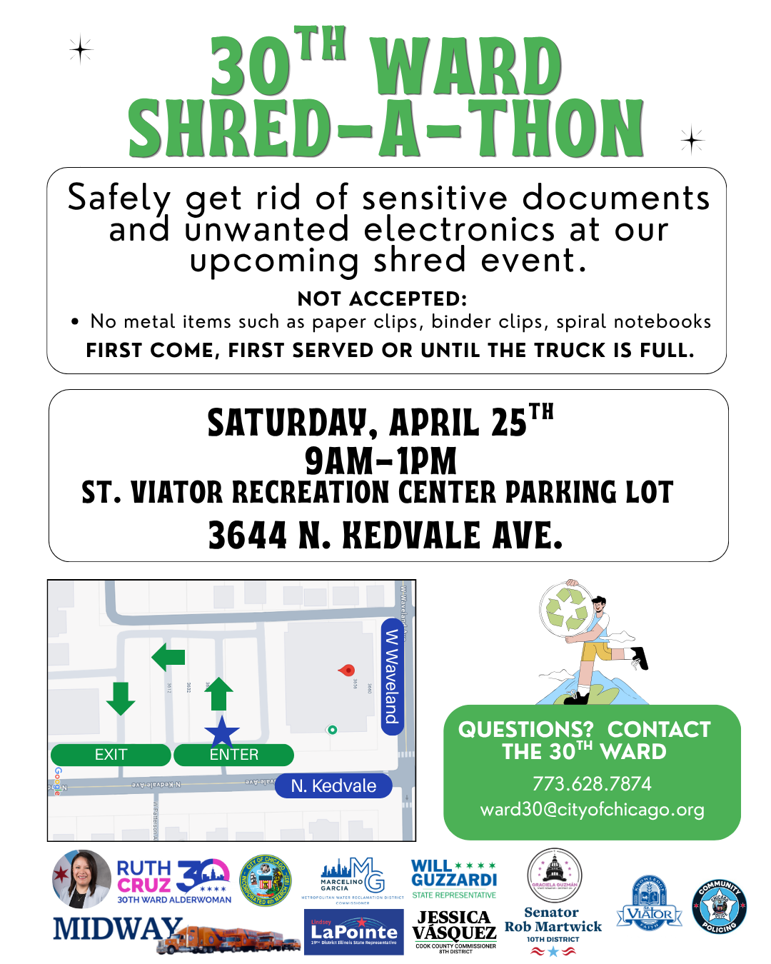 Safely dispose of sensitive documents and unwanted electronics at Ald. Ruth Cruz’s upcoming shred event. Join us on Saturday, April 25, from 9am to 1pm, or until trucks are full. The Shred-a-thon will be at the St. Viator Recreation Center Parking Lot, 3644 N Kedvale. For any questions or concerns, contact the 30th Ward office at (773) 628-7874 or ward30@cityofchicago.org.