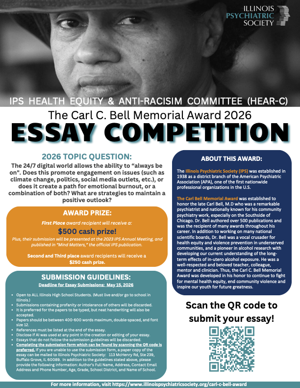 The Illinois Psychiatric Society is hosting their third annual Carl C. Bell, MD Memorial Award Essay Competition as a community initiative for Illinois High School students. This essay contest is open to all high school students in Illinois, and submissions are due on Friday, May 15.