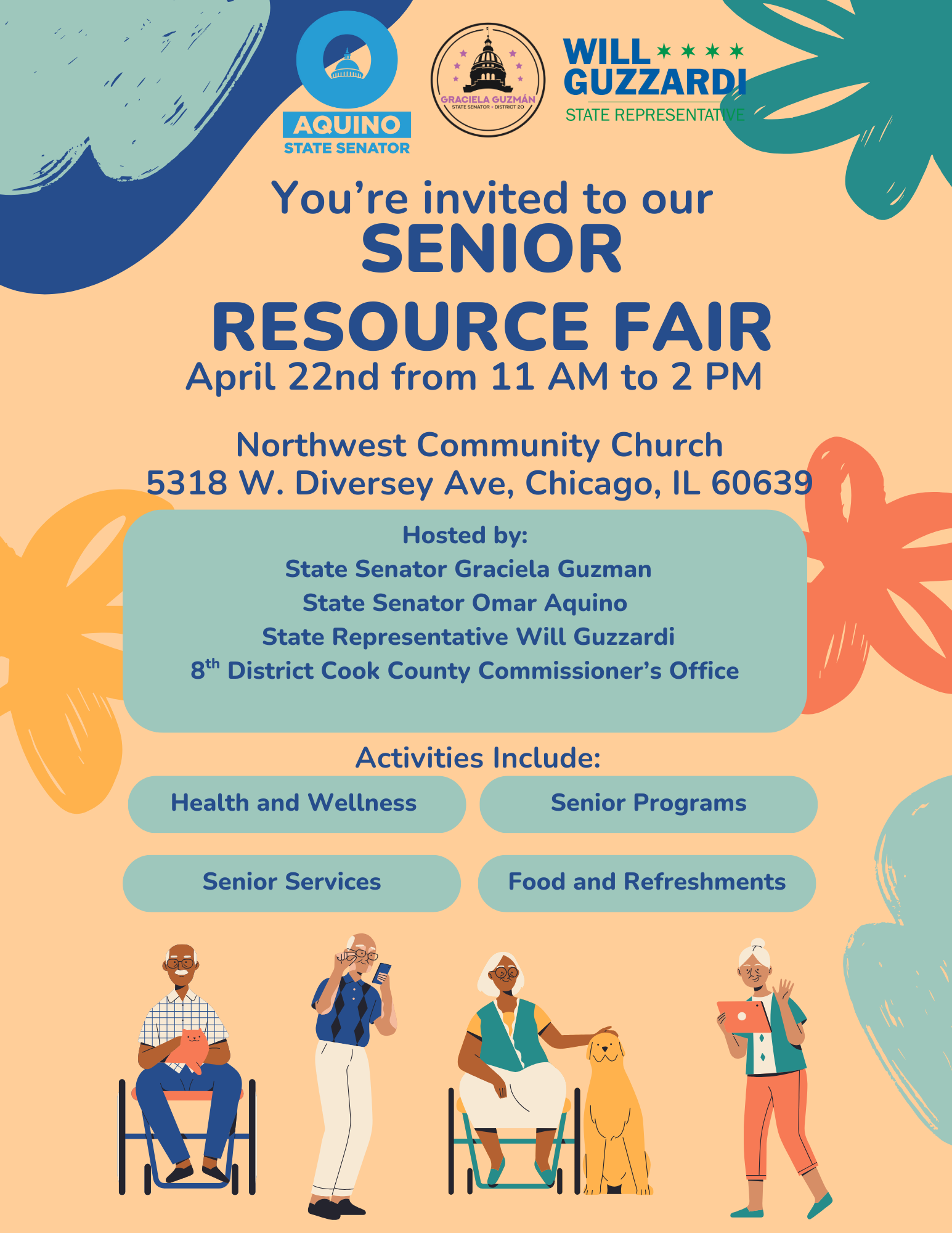 My office will be joining Senator Graciela Guzman at their Senior Resource Fair on Tuesday, April 22 from 11am to 2pm, at Northwest Community Church, 5318 W. Diversey Ave. Enjoy health and wellness activities, senior services and programs, and refreshments.